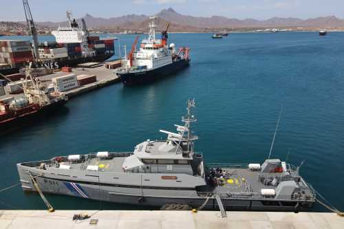 The Coast Guard’s patrol vessel Guardião in the port of Mindelo, São Vicente, Cabo Verde. In the background moors the German research vessel Meteor. -